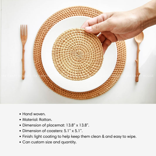 Handwoven Round Rattan Placemats and Coasters Set of 6