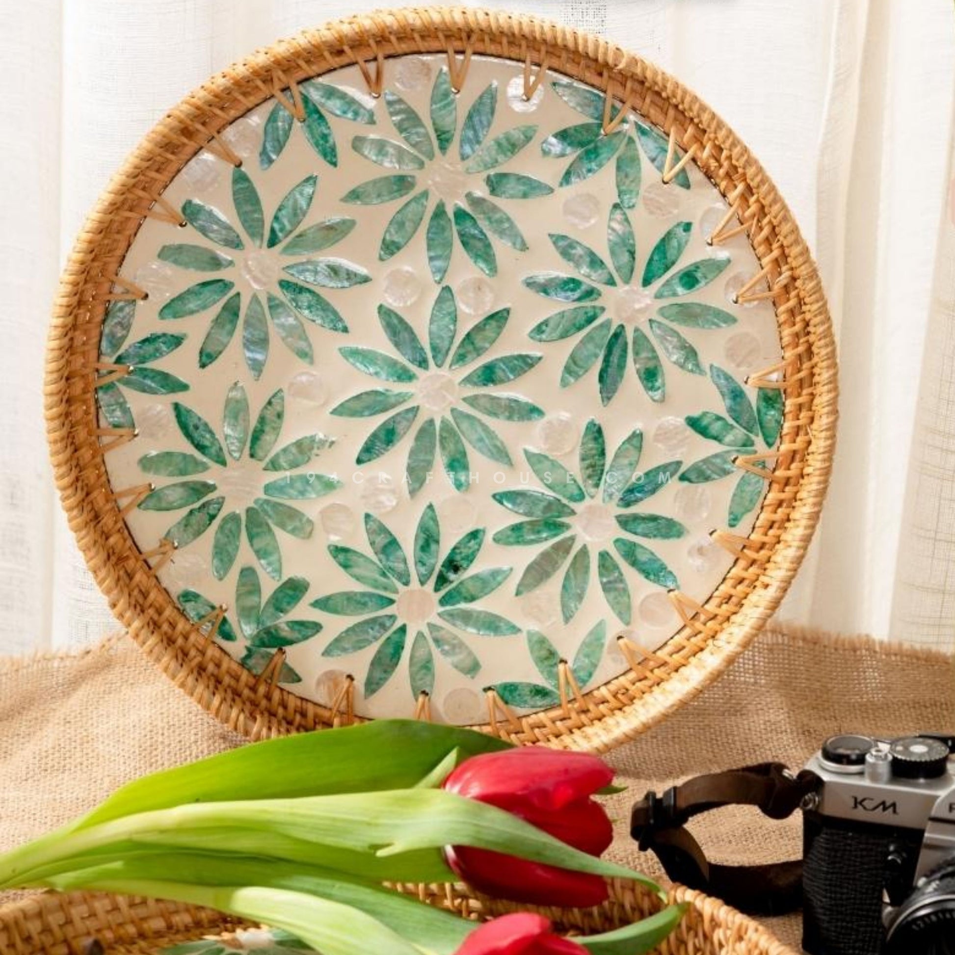 Handwoven Green Flower Pattern Round Rattan Tray With Mother of Pearl Inlay Wooden Base is handwoven from natural rattan, Mother of Pearl. It's a unique, exquisite, and delicate pattern perfect for serving, home and living decoration, restaurant coffee shop decor, and gifts.
