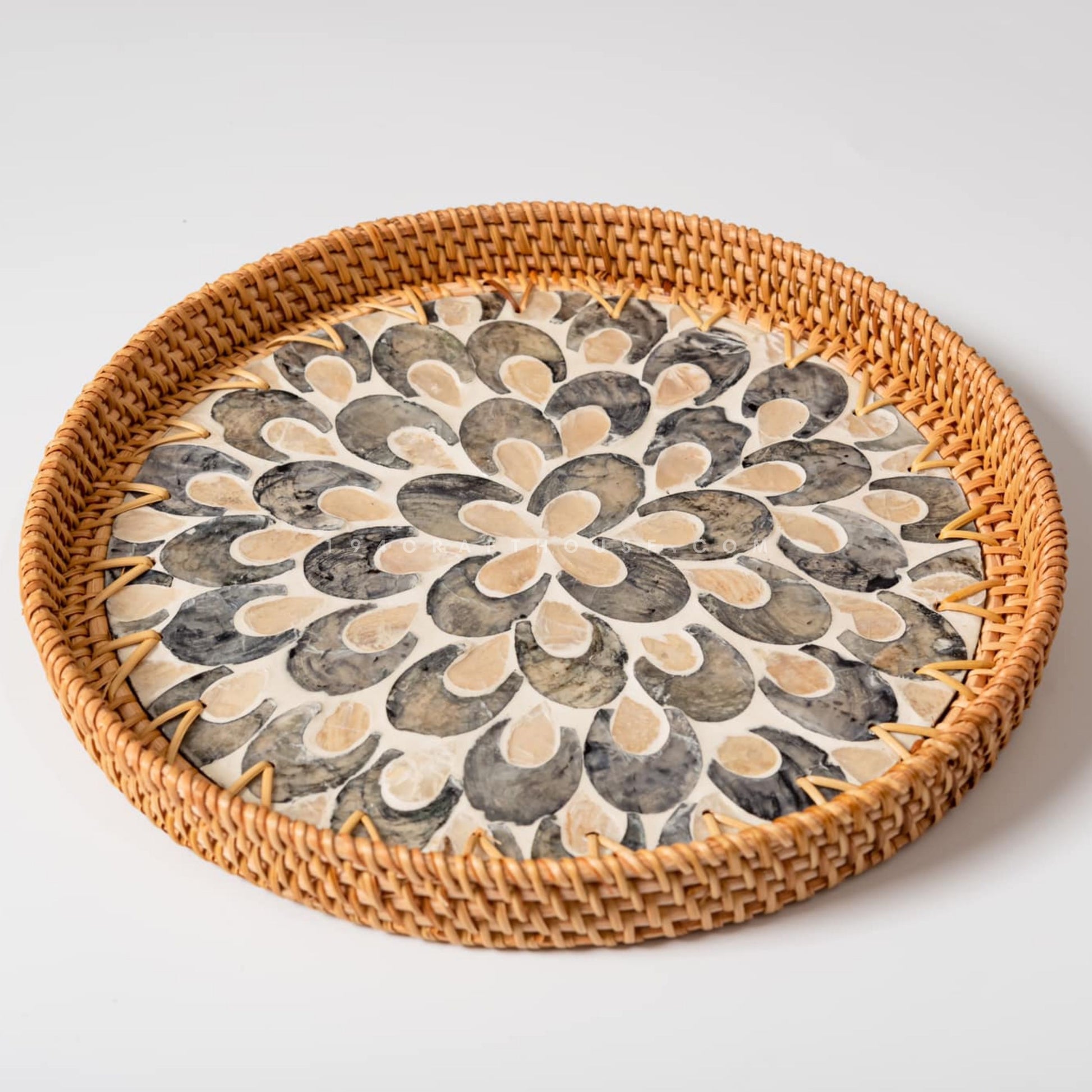 Handwoven Round Rattan With Mother of Pearl Inlay Tray