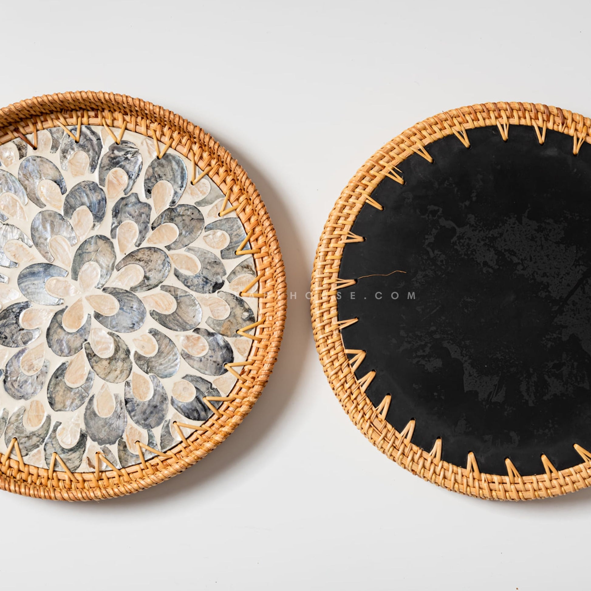 • Materials: The trays are handwoven from rattan with Mother of Pearl inlay. Suitable for use with non-stick kitchenware, eco-friendly and sustainable.