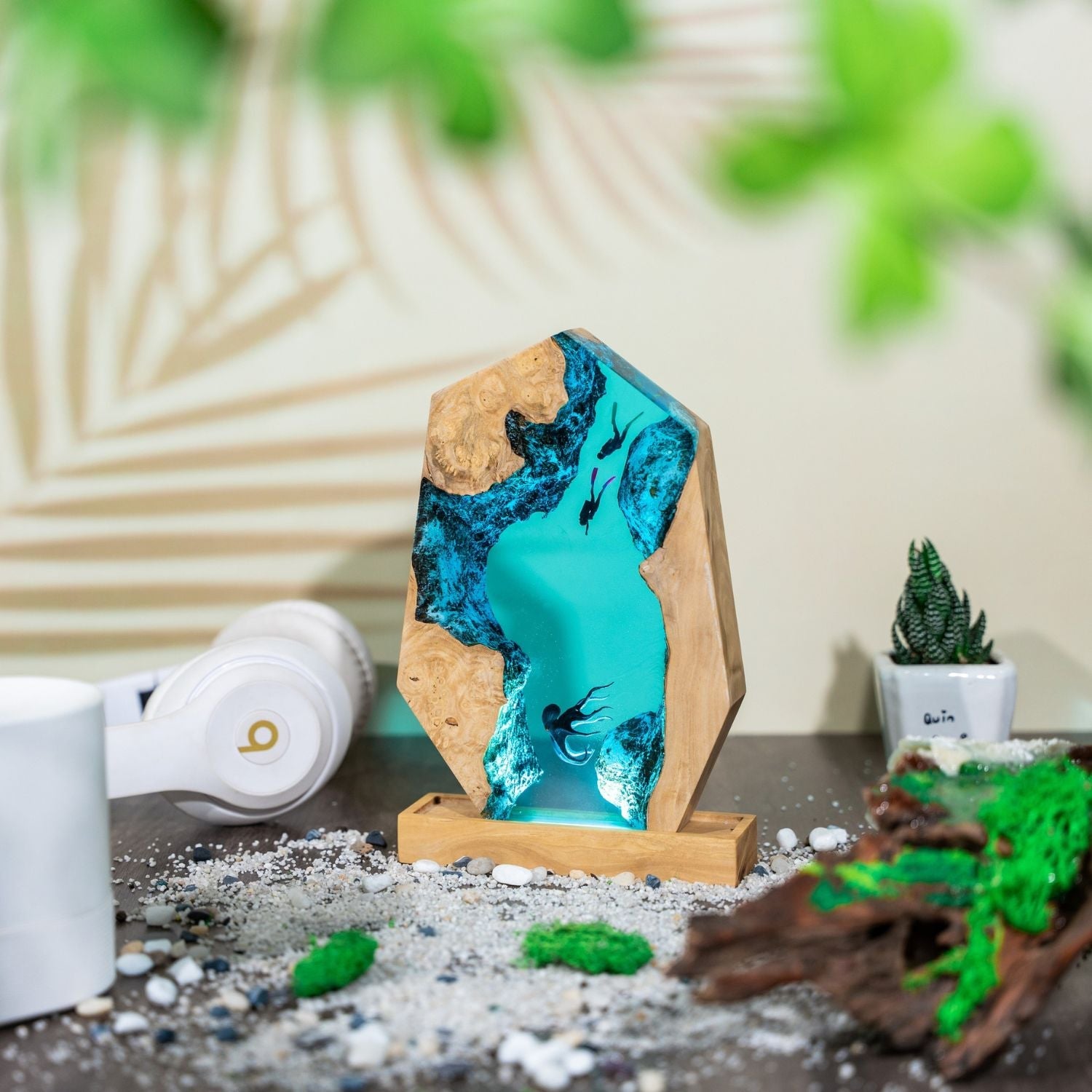 Hand-poured with layers of translucent resin and embedded ocean details, this piece isn’t just a lamp — it’s an artwork that tells a story. When lit, the warm light travels through the resin, illuminating every curve of the waves and creatures within, creating a peaceful and enchanting ambiance.