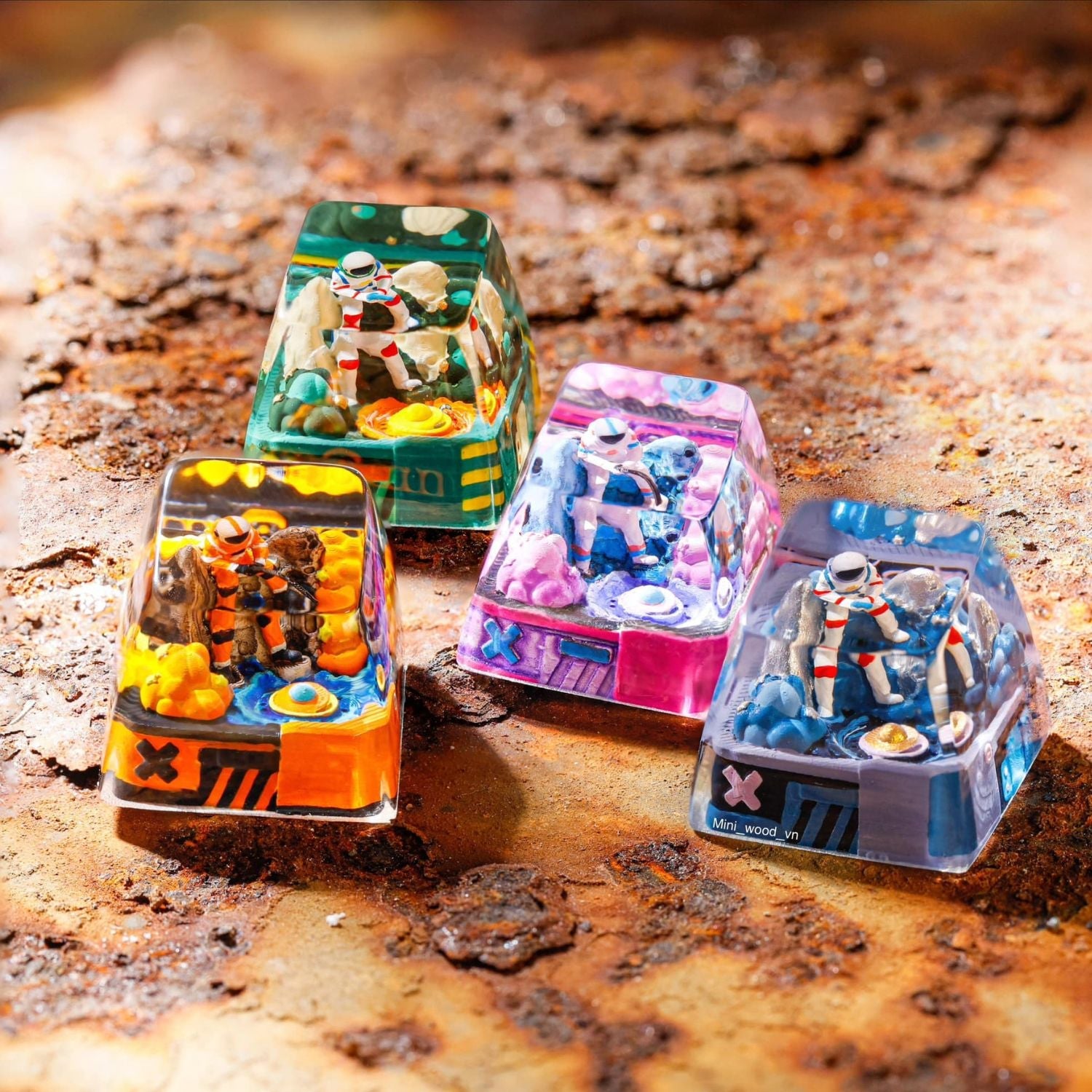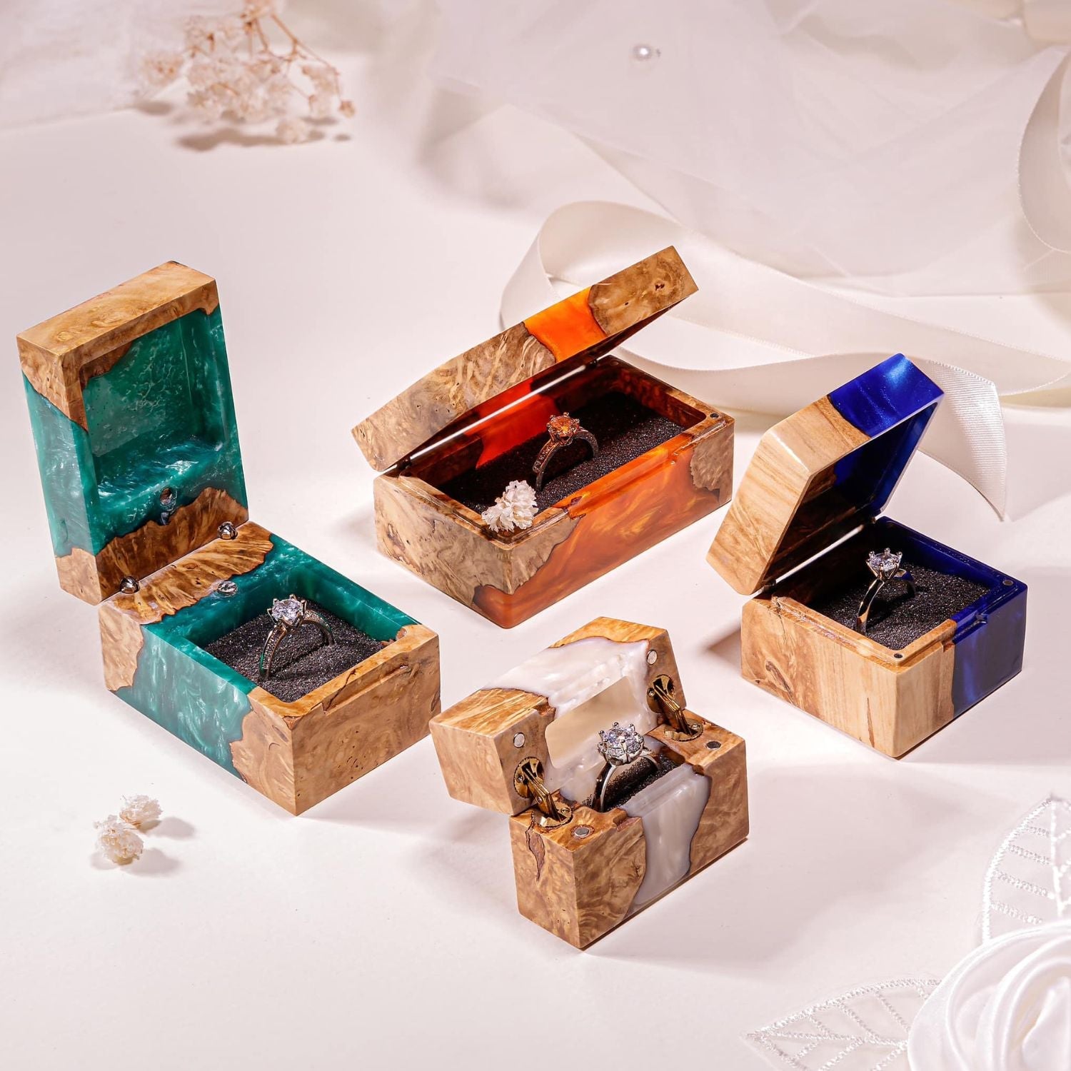- Hand-cast epoxy resin with layered ocean design.